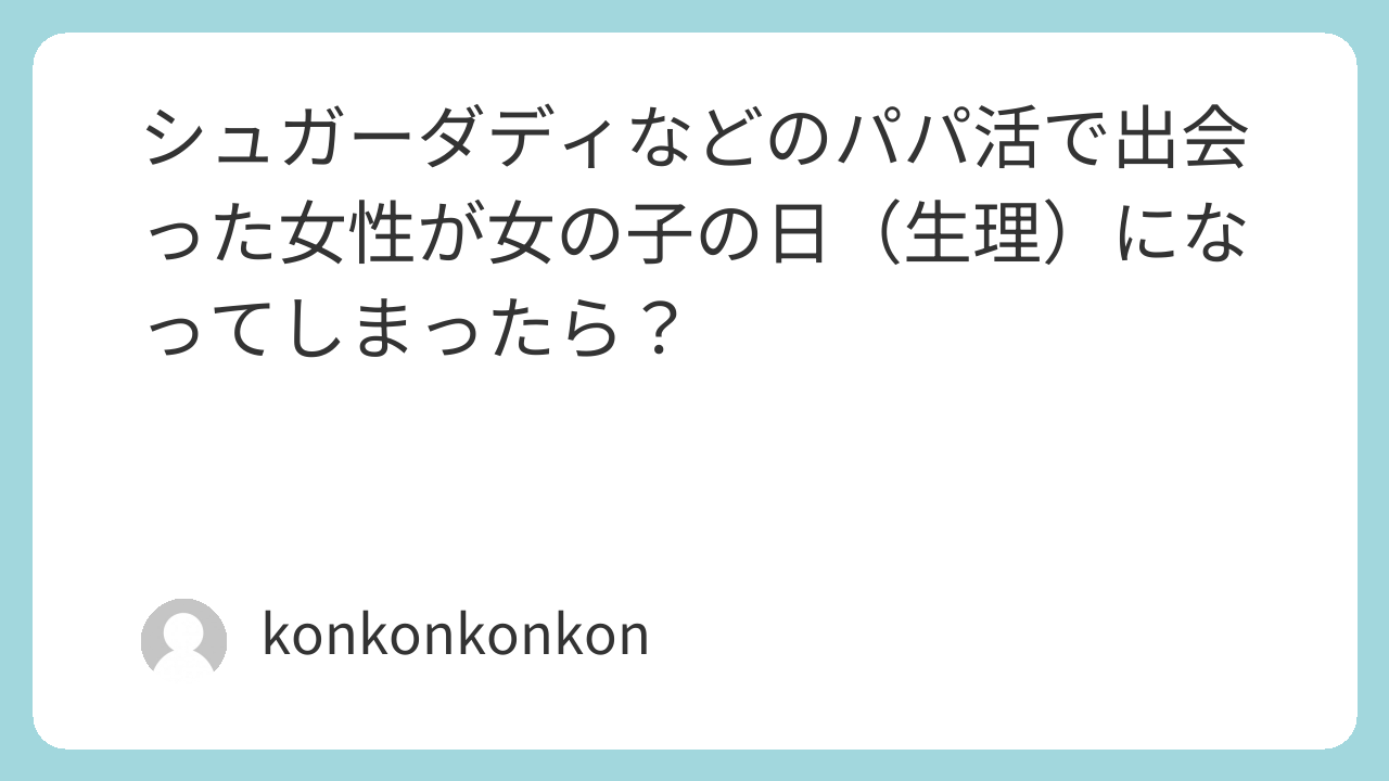 シュガーダディなどのパパ活で出会った女性や出会い系の女性が女の子の日(生理)になってしまったら?ということで見解をかいておきます。僕は弟がいるので男性の2人兄弟になるのですが、女性と高校生の時からお付き合いをしてきてかれこれ30年ぐらいになるのでこういう瞬間は多く経験してきました。