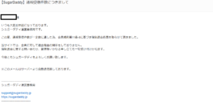シュガーダディさんの運営もいろいろと規約が変わったりしますので、タイミングとかによると思うのですが登録しているメールをよくみているとこういうメッセージがきたりします。