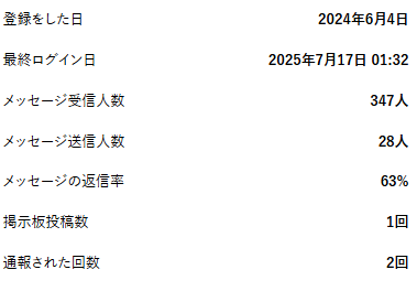 この機能についてはまた別で解説をしたいと思いますが、掲示板にどれぐらい投稿しているかや男性とどれぐらいメッセージをやりとりしているか、あるいは男性からメッセージが来たときにどういう返信をしているか、何回ぐらい返信しているかなどが見れるので、割と分析していくと便利な機能なのかなというふうに思います。
