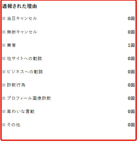 実際に自分が会うときに「この女の子は大丈夫なのかな」というふうに不安を感じることがあれば、この通報の箇所を見てみましょう。通報の箇所で気をつけたいなぁというふうに思うのは、当日ドタキャンやキャンセルという項目がついているような場合は、その子が当日約束をしても現れない、来ないっていうような可能性があります。