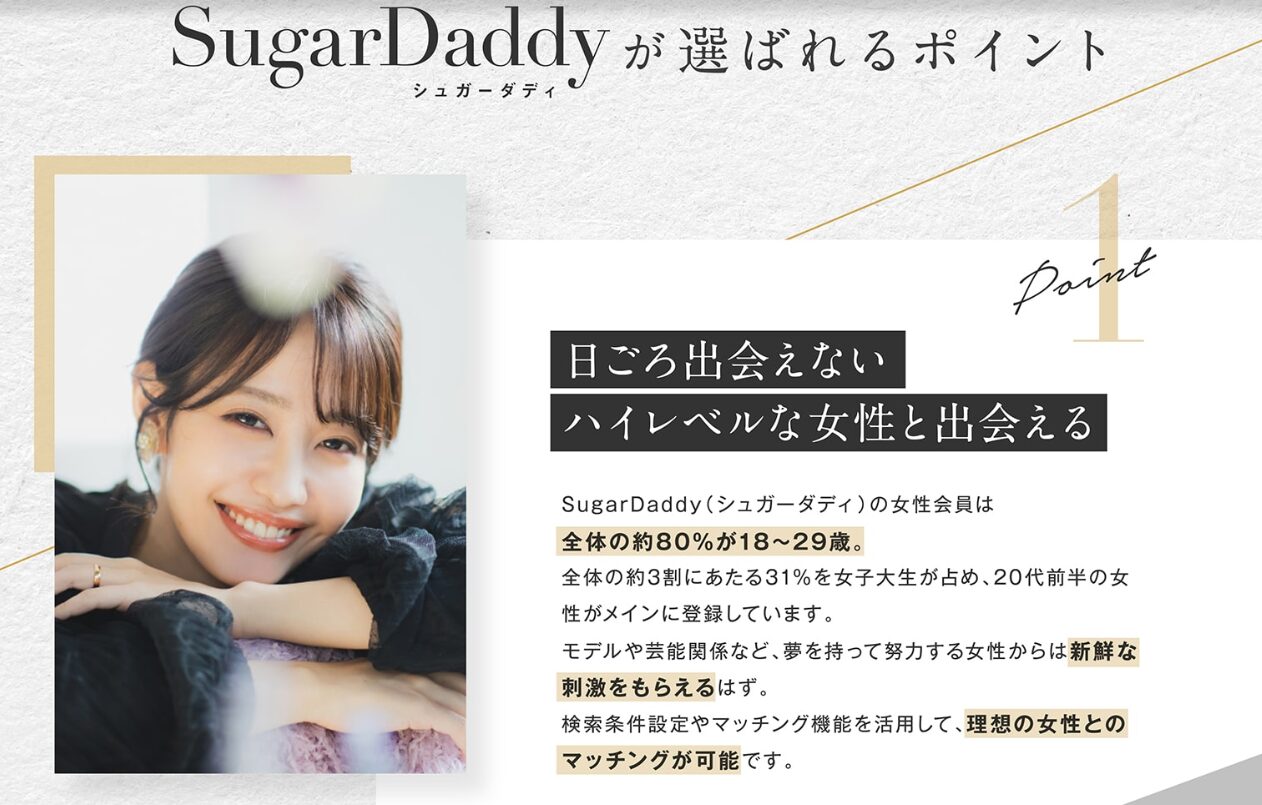 今まで私も何人もあってきていて、体験談などもたくさん書いていますが、多くのかわいい女性やいい女性が登録しています。よって1番はシュガーダディをおすすめします。
